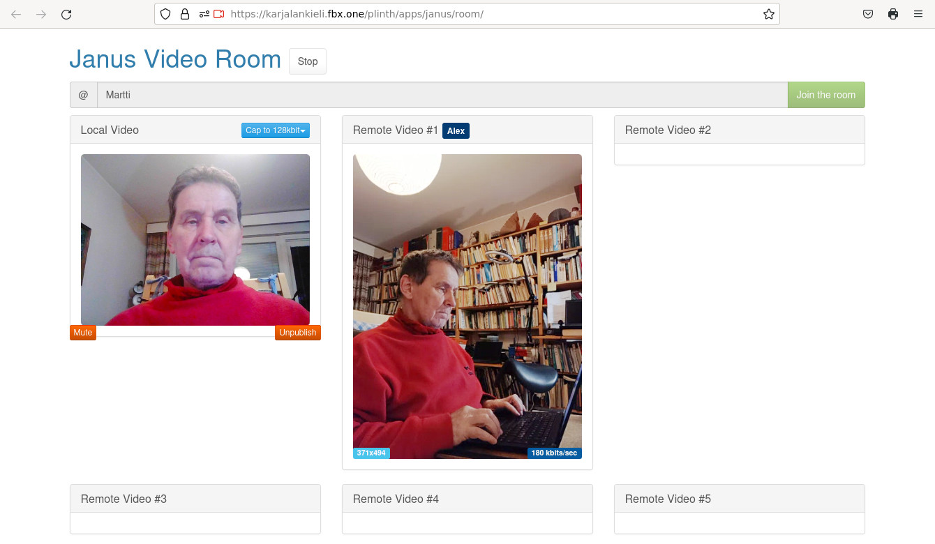 Ku ohjelmat coturn da janus oldaneh azendettu, palvelimen kodisivul https://verkotunnus/ nägyy janus-ikonu da sen tagua löydyy minimualine videonevvotteluohjelmu, kudamas voi olla kuuzi ozanottajua kuvan da iänenke.